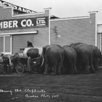 - "Watering the Elephants;" four elephants being watered with a horse-drawn tank in front of the Ostrander Lumber Company; several men look on.