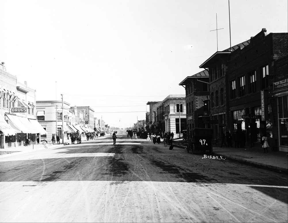 - Looking southeast down Main Ave. Visible buildings and businesses include: Drugs; First National Bank, Rogerson Hotel, Twin Falls Bank and Trust, Hotel Perrine, Buhl Land; Twin Falls Grocery.