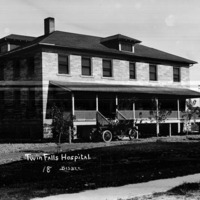 - Twin Falls Hospital; large brick building with a wide front porch area; an automobile (car) is parked in front and a buggy and horses are at the side. This building was enlarged from the original building.