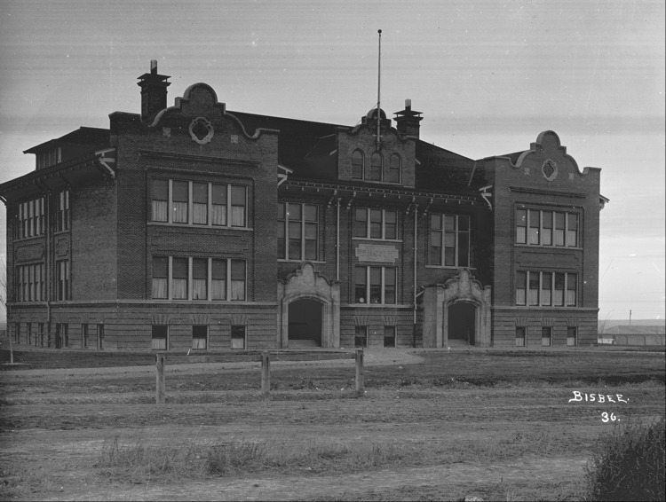 - Lincoln School soon after construction. The athletic field outbuilding is in background at right.