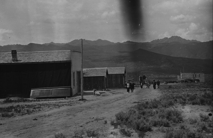 - Wood frame buildings line a dirt road of an unknown town. Several people gathered near a building in the background, or walk along the street. Mountains in background.