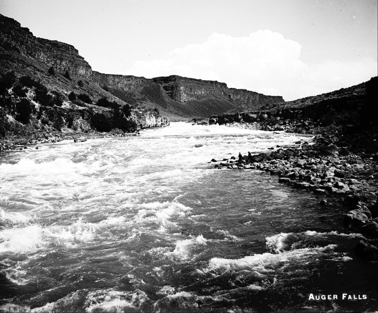 - "Auger Falls;" rapids on the Snake river south of Jerome, Idaho. Two men stand on rocky bar at the right, one holds a fishing pole.