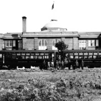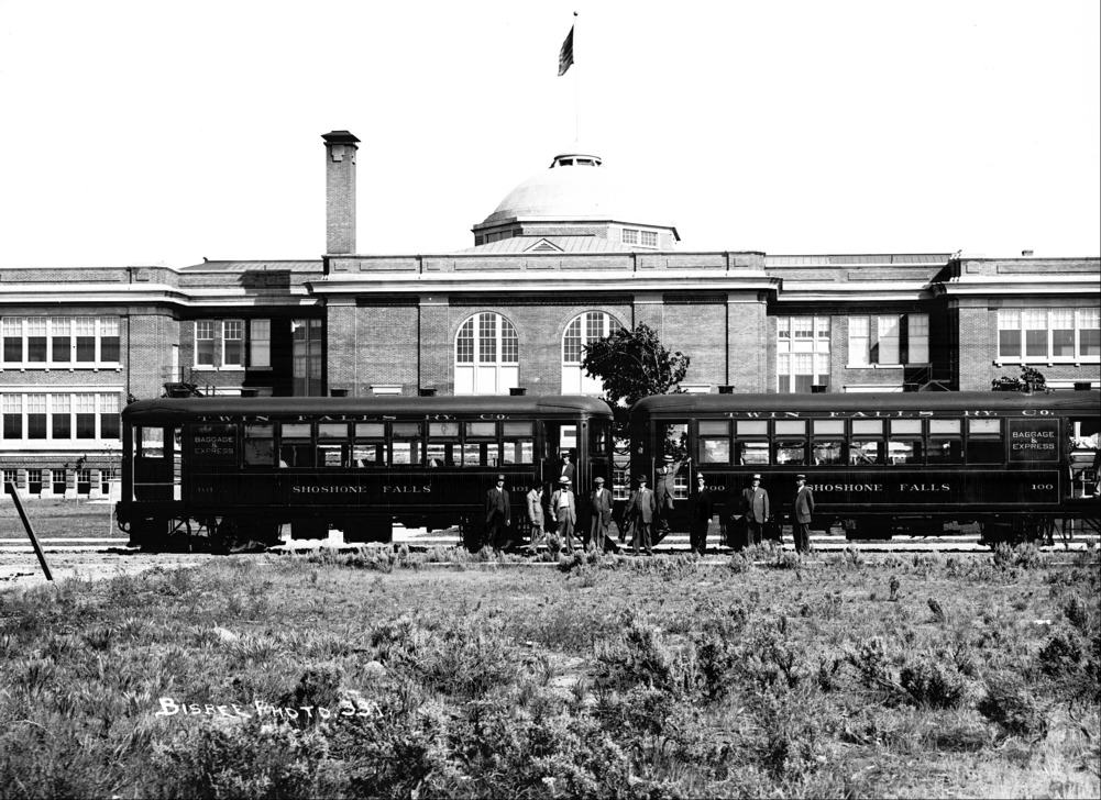 - Two cars of the Twin Falls Electric Railway, parked behind the Twin Falls High School, with several men posing with the train.