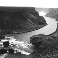 - A view of the Snake River Canyon, looking east, showing both Pillar Falls and Shoshone Falls (waterfalls). {Image is horizontally flipped.}