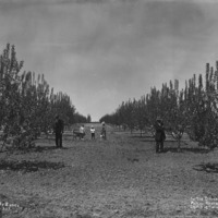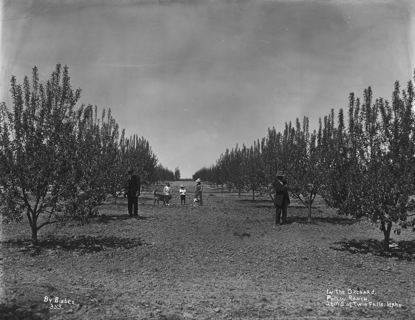 "In the Orchard; Polzin Ranch, 2 1/2 miles south of Twin Falls, Idaho; Several people standing amongst apple trees.