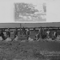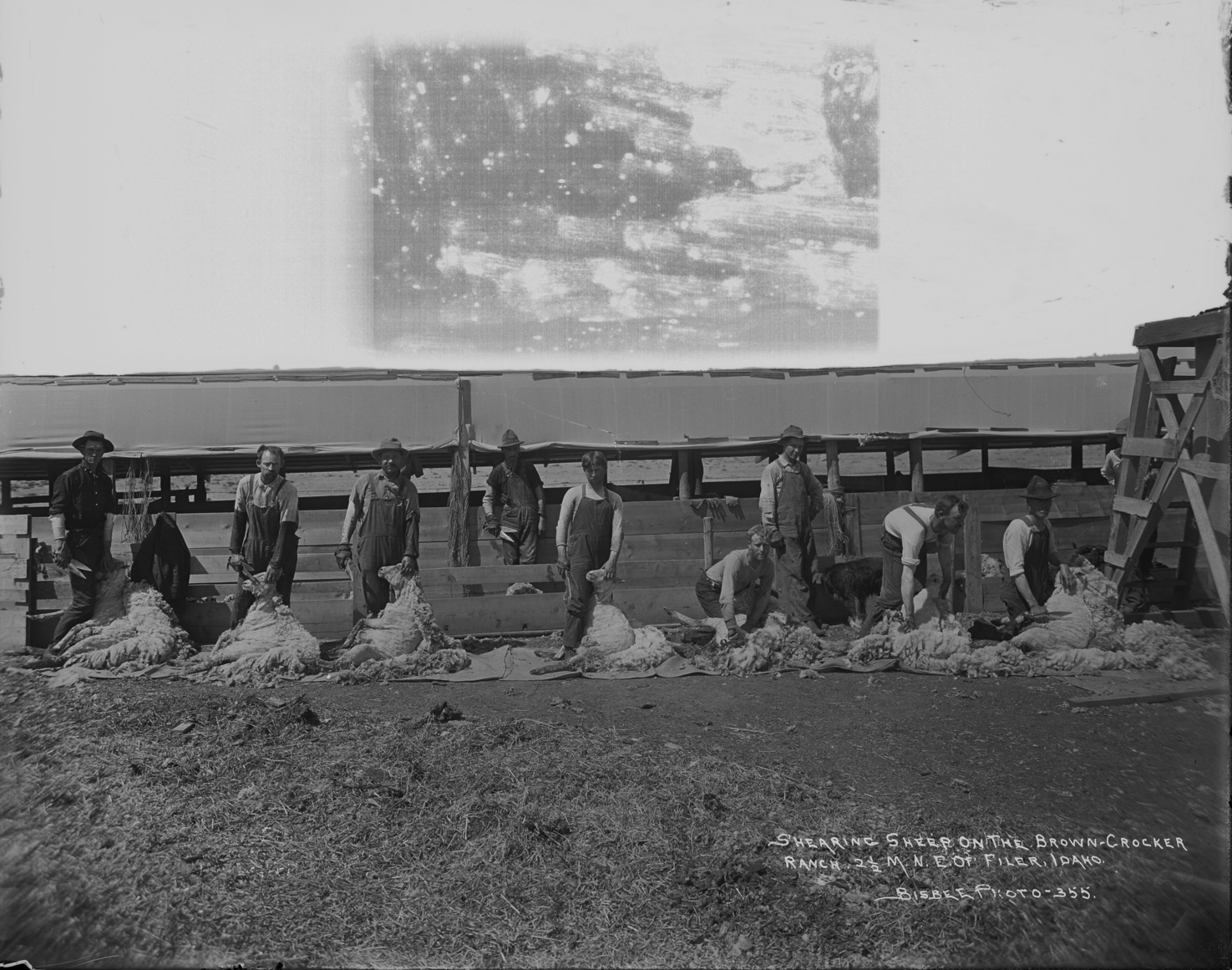 "Shearing Sheep on the Brown-Crocker Ranch, 2 1/2 miles northeast of Filer, Idaho; men working in shearing stalls