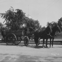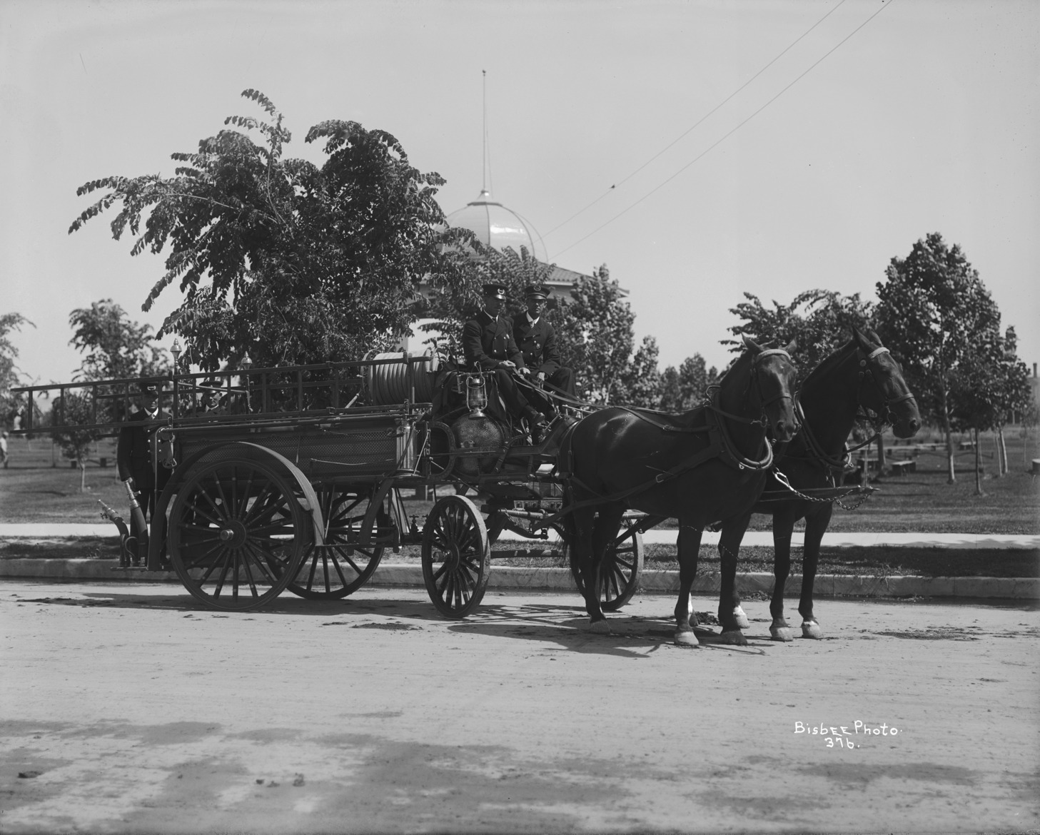 - Twin Falls Fire Department; hose and ladder wagon drawn by two horses; City Park with gazebo (band stand) in the background.