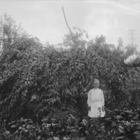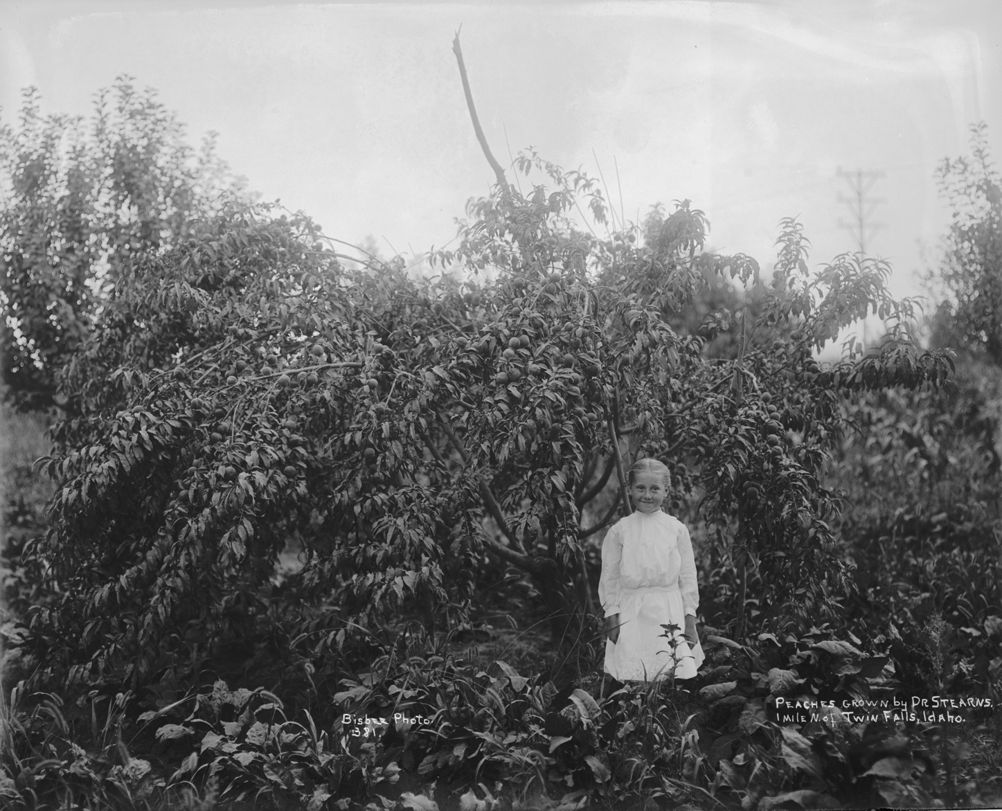 "Peaches Grown by Dr. Stearns; 1 mile north of Twin Falls, Idaho;" little girl standing beside fruit tree.
