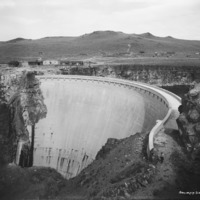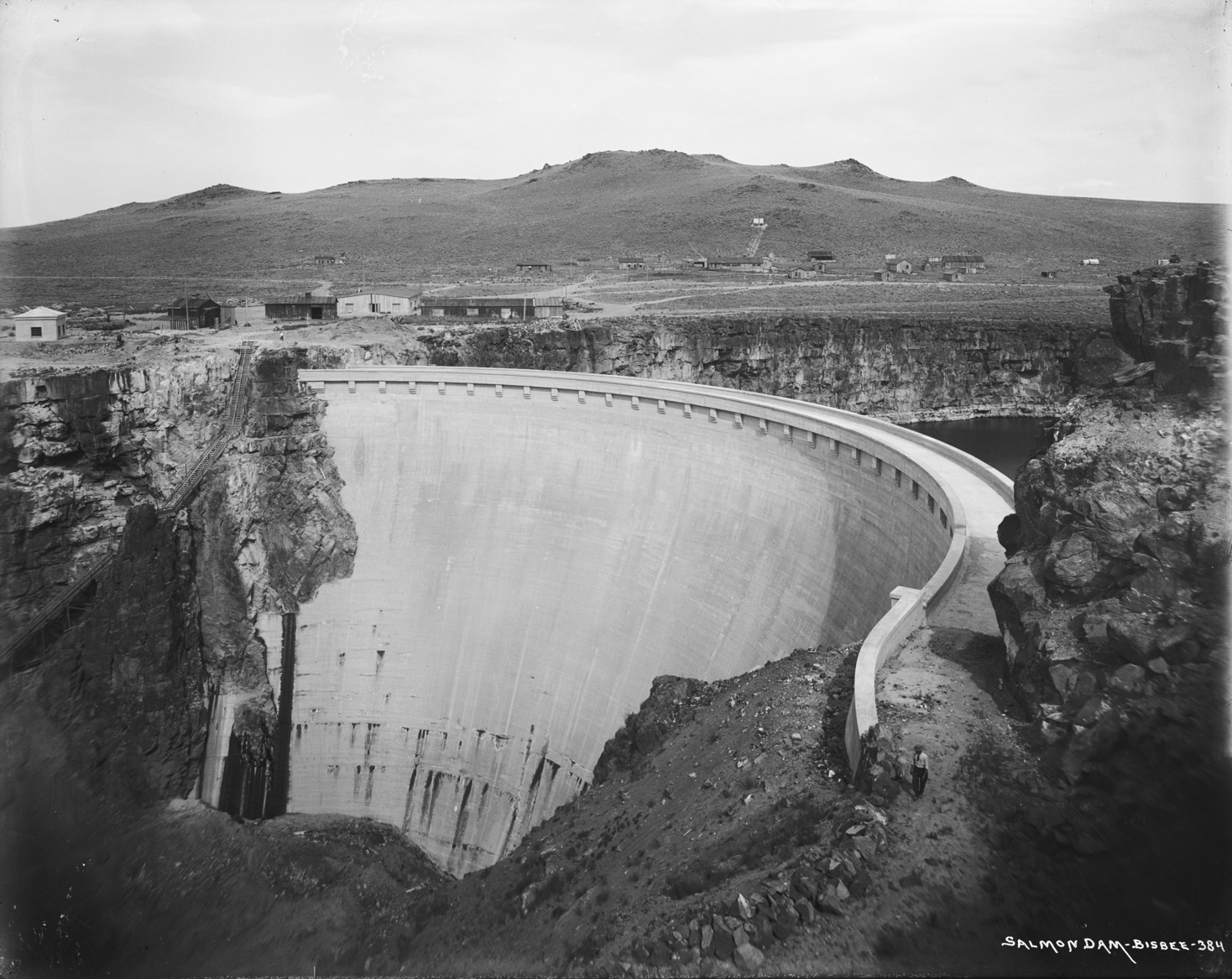- "Salmon Dam;" view below the reservoir; buildings in background
