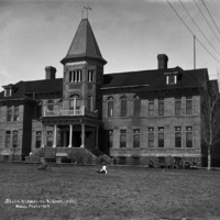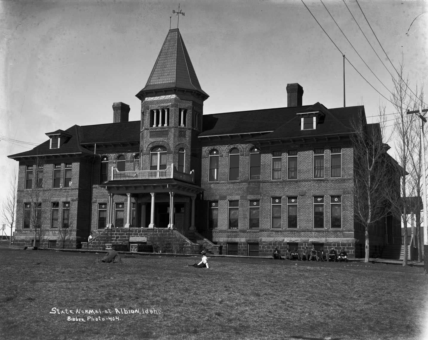 - "State Normal at Albion, Idaho;" school building; people sitting on lawn and edge of lawn; woman at stairs
