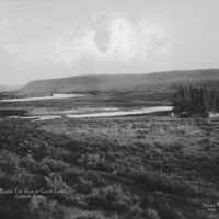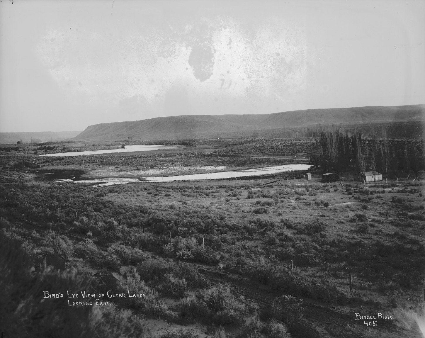 - "Bird's Eye View of Clear Lakes Looking east;" house and outbuildings near lakes north of Buhl, Idaho.