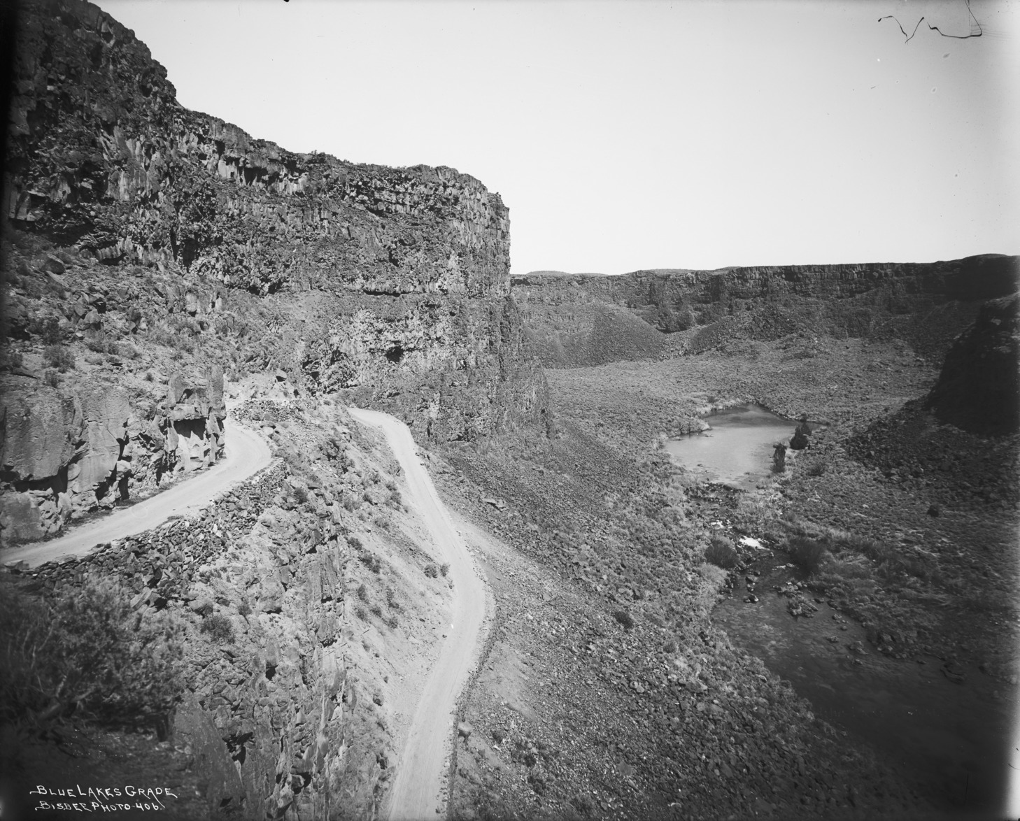 - "Blue Lakes Grade;" road descending from the north side of the Snake River Canyon, with the Blue Lakes visible