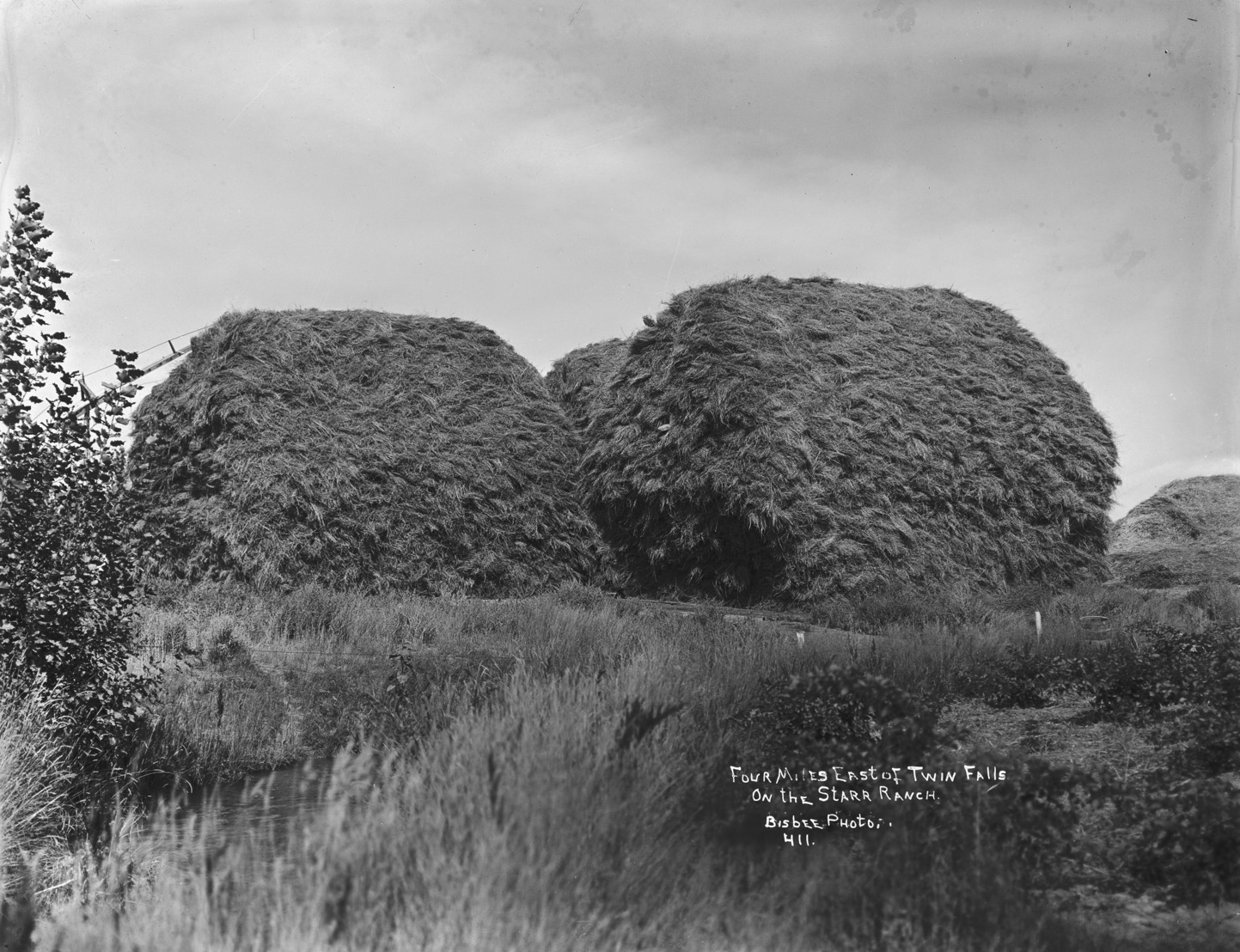 - "Four miles east of Twin Falls on the Starr Ranch;" large hay stacks