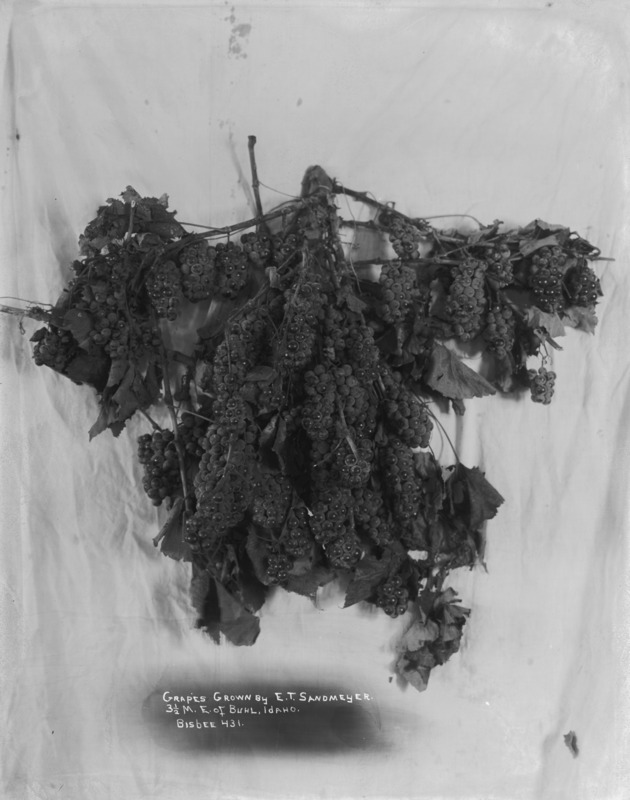 - "Grapes Grown by E.T. Sandmeyer, 3 1/2 miles east of Buhl, Idaho;" cluster of grapes against a blank backdrop
