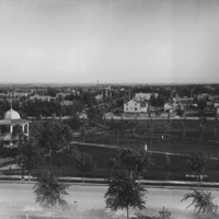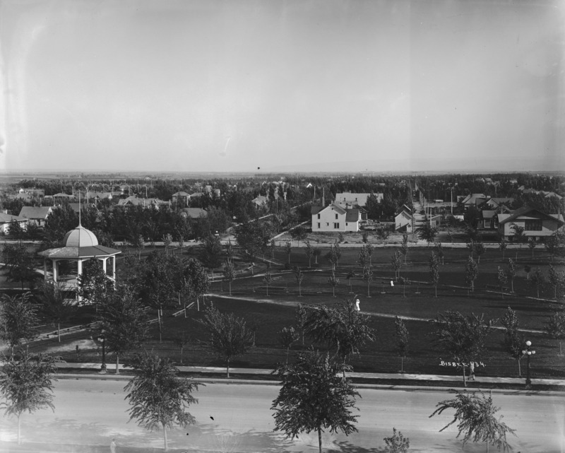 - Wide aerial view of Twin Falls City Park, taken from atop the County Court House, looking east