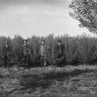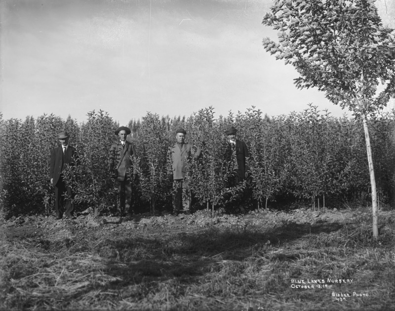 - "Blue Lakes Nursery. October 13, 1911;" Four men standing in front of fruit trees. I.B. Perrine is on the left.
