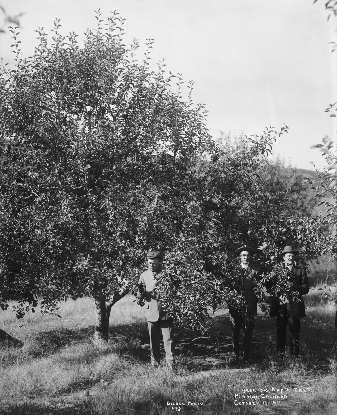 - "14 year old Apple tree. Perrine Orchard, October 13, 1911;" three men beneath fruit tree