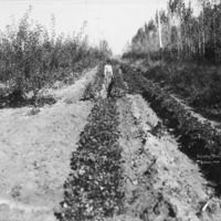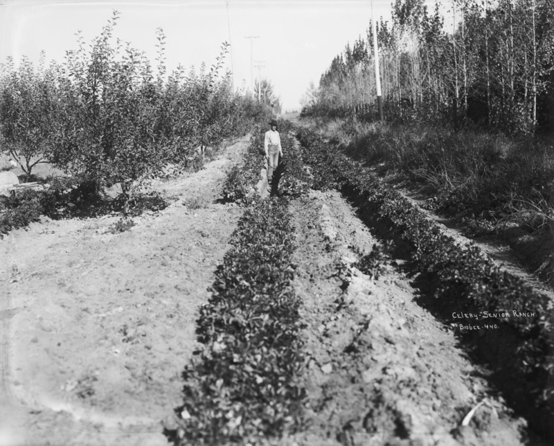 - "Celery - Senior Ranch;" man standing among celery plants; power lines alongside rows