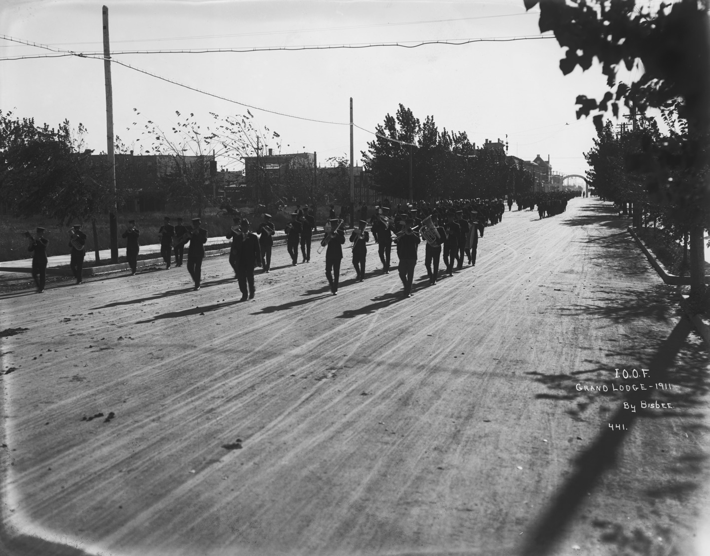 - "I.O.O.F. Grand Lodge - 1911;" parade of men on Shoshone Street; archway over Shoshone can be seen in background