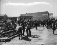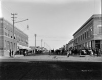 1360 A muddy downtown street in Buhl, Idaho. Visible businesses and signs include Citizens State Bank; General Store; O. Clark Stone, Lawyer; The Golden Rule; Hardware; Contractors and Builders; Harness Shop; Peck's Grocery; Buhl Hotel is center right