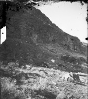 1362 A hay wagon in a hayfield. One man in field, one man on top of wagon. House and outbuilding in the background.