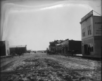 1359 A muddy street through downtown Buhl, Idaho. Visible business signs include "Idaho Realty: Twin Falls Investment Co.;" "A. Popenoe: Candies, Fruit, Cigars, and Tobacco;" "Cammack Bros: Gents Furnishings;" "Buhl Restaurant;" "The Idle Hour Saloon;" "Furnishings and Carpet;" "Undertaking, Embalming"