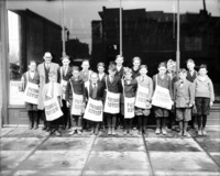 1321 A group of newsboys posed in front of a building, with bags marked Pictorial Review.