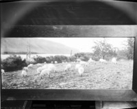 1320 A band of sheep, in a picture mounted in a wooden frame.