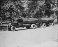 1251 A truck labeled Al Smith, Inc., Distributors, hauling gasoline; parked before area with large trees.