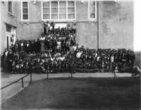 1256 Six cast members of an amateur theatrical, standing on a stage set.