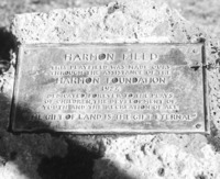 1212 Harmon Park; The plaque identifying the park. It reads: Harmon Field; This playfield was made ours through the assistance of the Harmon Foundation, 1924. Dedicated forever to the plays of children, the development of youth and the recreation of all. "The Gift of Land is the Gift Eternal." William E. Harmon