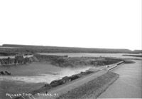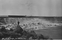 PC-2069 "Milner Dam;" view from above the gates of the dam. A man stands on the berm.
