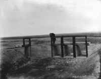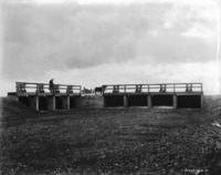 S 037 A man stands atop canal gates over a dray canal bed. A two-horse-buggy stands near the gates.