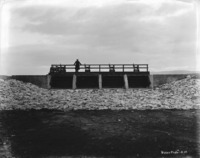 S 027 A man (possibly Clarence Bisbee) stands along concrete dam in a canal system.
