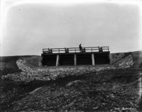 S 036 A man and a two-horse buggy stands on a low bridge over a dry canal.