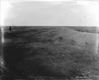 S 039 A man and a dog stand at the bottom of a recently dug wide canal bed or channel.