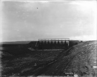 S 009 A two-horse buggy stands on a low bridge above a dry streambed or canal amidst the sage brush. A man stands beneath the bridge.