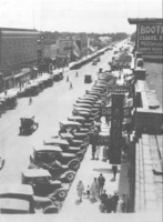 GB 092 A view of busy Main Ave, looking southeast and taken from the top of the Twin Falls Bank and Trust building. Automobiles (cars) line the street and several people are on the sidewalks. Business and buildings visible include: Rogerson Hotel; the Golden Rule; American Electric Co.; Marketeria Cash and Carry Grocery; Idaho Department Store, Twin Falls Hardware, Booth Mercantile; Diamond Hardware; L. Rasmussen Jewelry; Candy