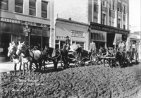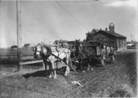 GB 078 A freight wagon pulled by four horses, stands along a muddy Twin Falls street. The first fire station, with the bell attached to the roof is directly behind the wagon. The Twin Falls Chronicle Newspaper building and other houses and buildings are also visible.
