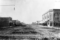 GB 008 "Filer, Idaho;" view down unpaved Main Street of Filer. Buildings and businesses visible include: lumber store; Strauss Outfitter; Filer Bank