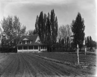 E 002 "A Farm Home, Near Gooding, Idaho;" a white house sits among several trees, with a plowed field in the foreground. A fence lines the property on right.