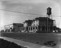 E 006 "At Gooding;" view of Main Street in Gooding, Idaho; showing the Lincoln Inn Hotel and another business block. A water tower stands behind the Inn. Businesses visible include a dry good store and the Golden Pheasant.