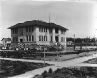 E 013 "Last Day of School, 1912. Gooding, Idaho;" a group of children pose in front of a three story brick school. Other houses and several wagons with horses can be seen in the background.