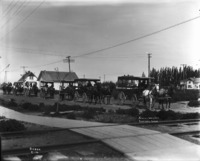 E 014 "School Wagons, Gooding, Idaho;" wagons, horses, and their drivers line a street. Several houses in the background, with a wooden boardwalk (sidewalk) and railroad tracks in the foreground.