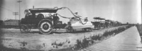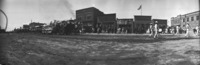 C 048 Panoramic view of a decorated steam tractor pulling a float and six wagons down an unpaved street lined with a wooden boardwalk (sidewalk). Two men stand on a rear platform of the tractor. Construction on a brick building in rear left