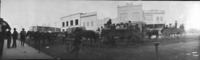 C 007 Panoramic view of Main Ave E, with several wagons, horses, and people in the street. Visible businesses and buildings include H. B. Johnson Hardware and Implements; the Harder Building; Young's Grocery and Seed House; First National Bank
