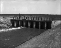 B 148 "Head Gate; North Side;" a man stands atop of a wall of canal gates.