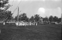 C 003 Several young girls dressed in white gather with ribbons near a maypole on May Day in Twin Falls City Park; several houses in background.