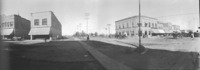 C 008 Panoramic view of the intersection of Main Ave and Shoshone St. Businesses and buildings visible include First National Bank (left), Perrine and Burton Merchandise (middle), Hotel Perrine (right).