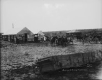 B 132 "Surveyor's Camp, North Side; men, teams of horses, and buggies stand in front of a couple of wood frame buildings and a tent among the sage brush. A wagon box without the wheels is visible in the foreground.